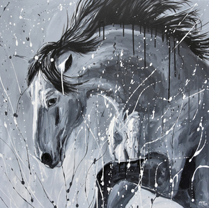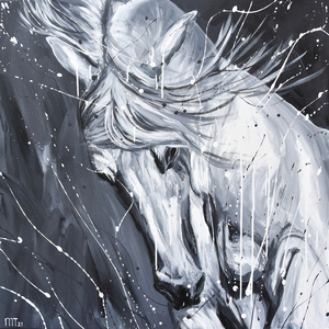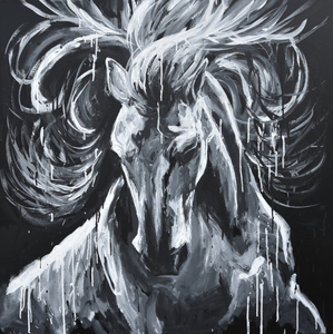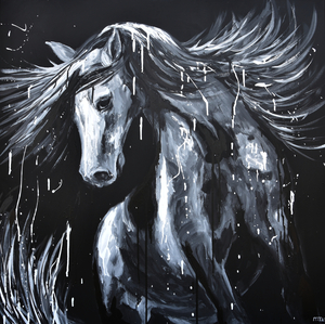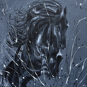 2021De laatste in deze 'black and white freedom series', omdat negen vierkante schilderijen samen weer een vierkant vormen. Een prachtig zwart paard, gebaseerd op een foto van Christa Merk.