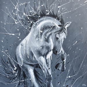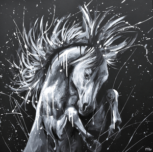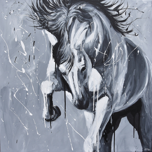 2021Een spelend paard, vrij en blij. In zwart en wit. Gebaseerd op een foto van Christa Merk.